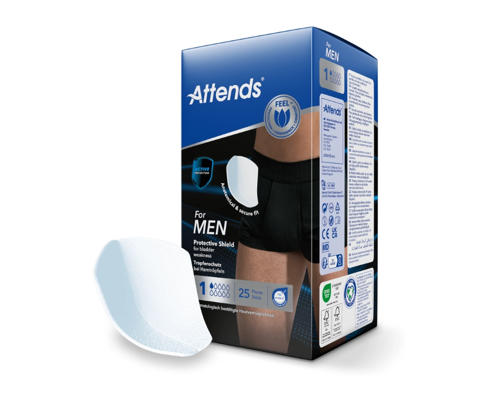 Attends For Men 1 sont des protections spécialement conçues pour les hommes souffrant d'une très légère faiblesse de la vessie. Les protections ont une forme de poche pratique et conviennent comme protection très fine du linge en cas de "gouttes nocturnes". En raison de l'absorption rapide du liquide, le produit offre une sécurité maximale et une sensation agréable et sèche. La protection pratique Attends Odour Protection protège contre les odeurs désagréables. Pour une tenue sûre, les serviettes Attends for Men 1 se fixent à l'aide de la bande adhésive dans des sous-vêtements aussi ajustés que possible. Elles peuvent également être portées avec les culottes de fixation Attends®. Avec une épaisseur de 1,5 mm, le produit est particulièrement discret à porter.