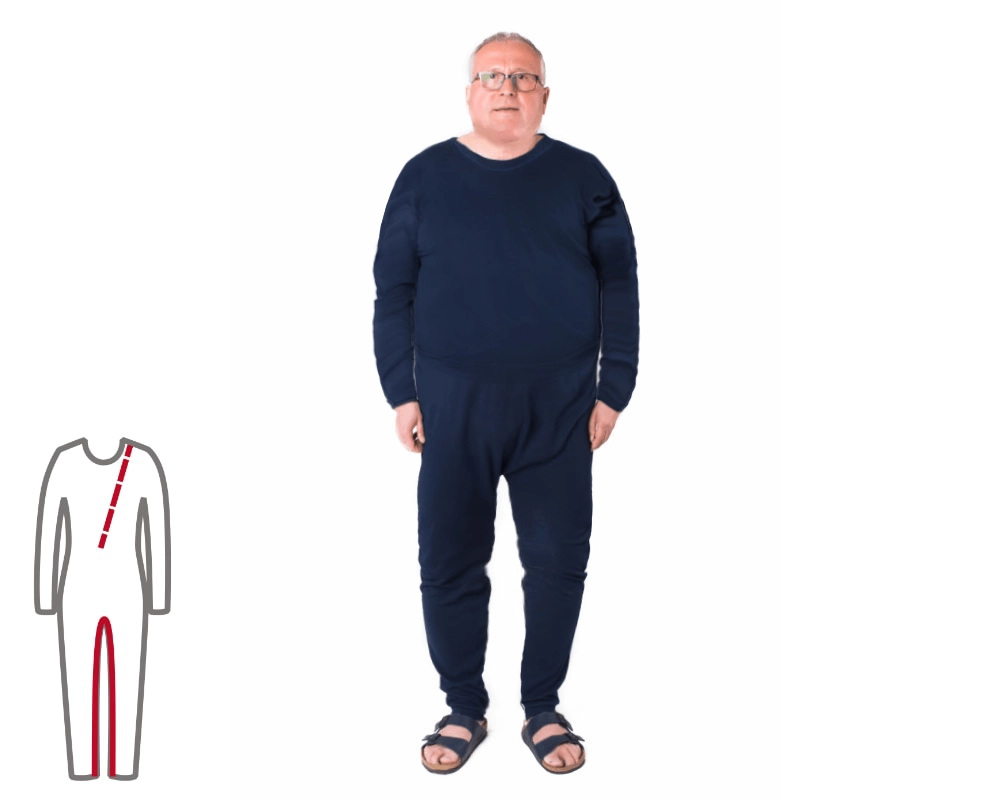 Der Overall ist äußerst bequem und hochwertig verarbeitet. Der schräge Rückenreißverschluss ermöglicht einen schnellen Zugang zum Oberkörper, während der zusätzlich gesicherte Beinreißverschluss den Wechsel von Inkontinenzmaterial erleichtert und das Risiko des Selbst-Entkleidens deutlich reduziert.