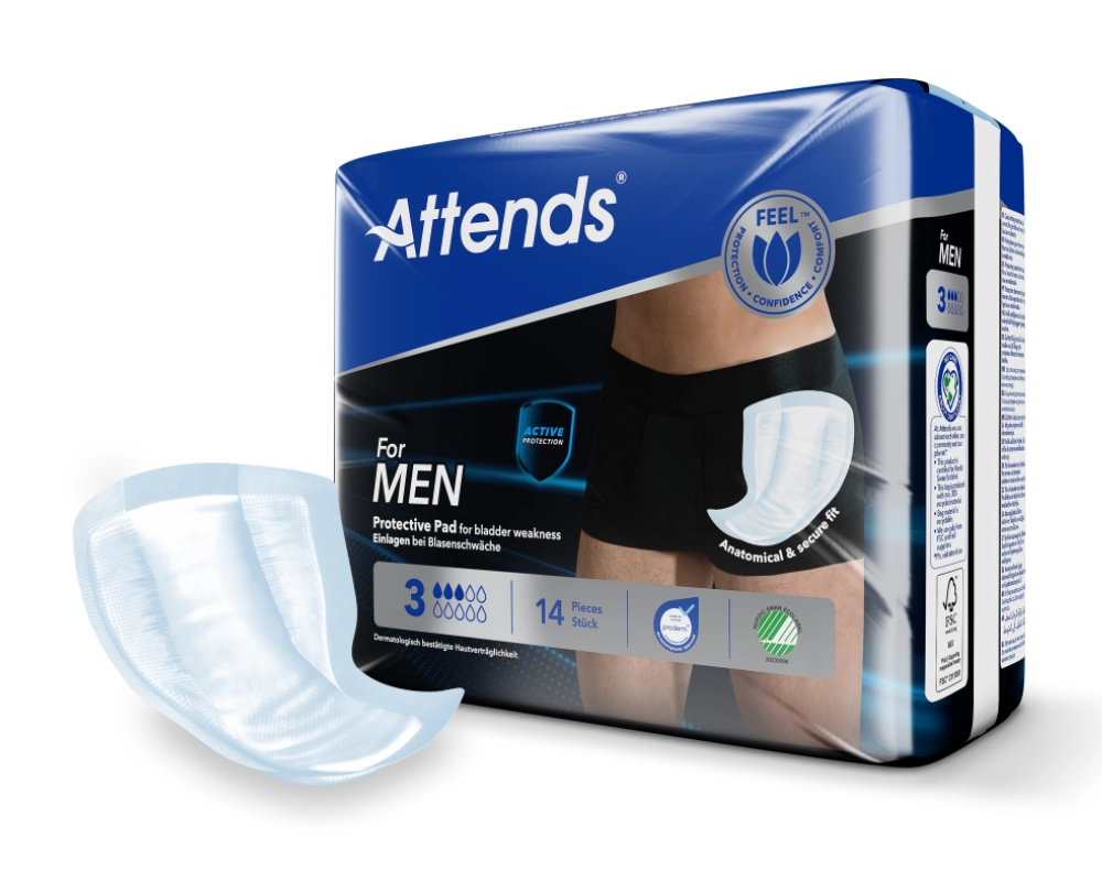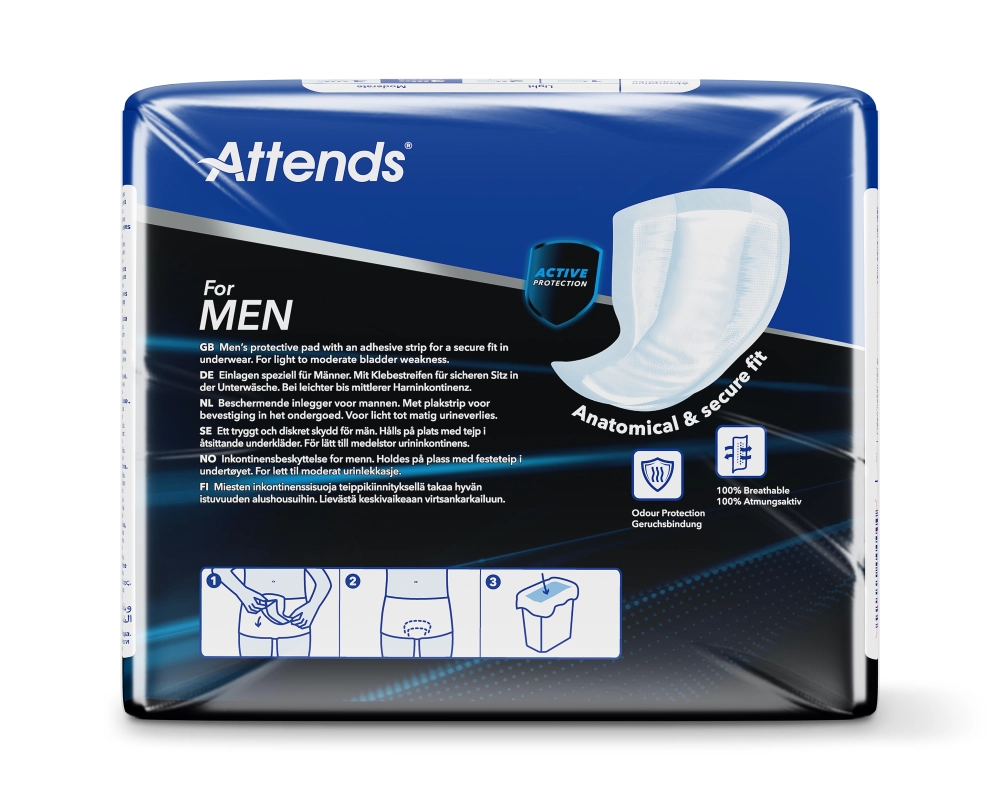 Attends For Men 3 ist eine Einlage, die speziell für Männer mit leichter bis mittlerer Blasenschwäche entwickelt wurde. Sie bietet zuverlässigen Schutz beim unkontrollierten Abgang kleinerer Urinmengen. Die Einlage überzeugt durch eine schnelle Flüssigkeitsaufnahme und sorgt dank der eingesetzten Materialien für Sicherheit sowie ein trockenes und angenehmes Tragegefühl. Spezielle Innenbündchen bieten zusätzlichen seitlichen Auslaufschutz. Die Rückseite ist mit einer atmungsaktiven Vliesschicht ausgestattet, die den Tragekomfort erhöht. Dank der Attends Odour Protection werden unangenehme Gerüche wirksam verhindert. Ein integrierter Klebestreifen ermöglicht eine sichere Fixierung in enganliegender Unterwäsche. Mit einer Dicke von nur 7 mm ist die Einlage besonders diskret zu tragen.