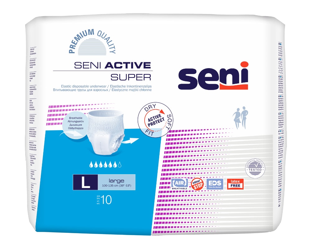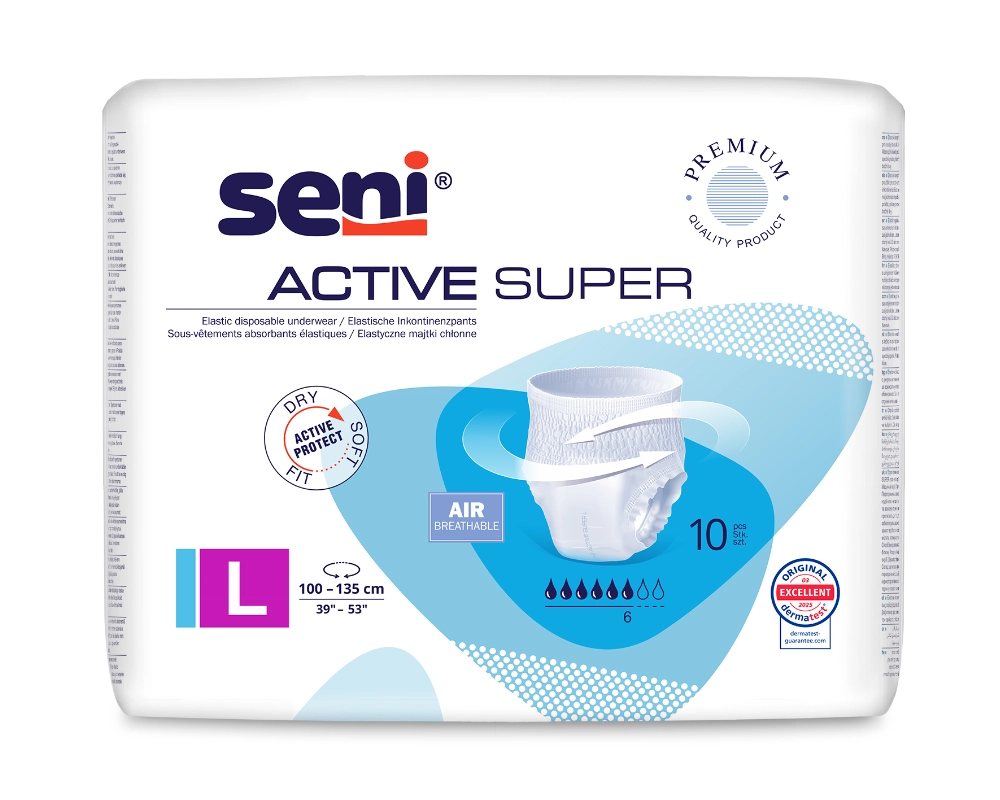 Seni Active Super sind atmungsaktive, elastische Inkontinenz-Pants, die sich wie normale Unterwäsche an- und ausziehen lassen – ideal für aktive Menschen, die Komfort und Diskretion im Alltag schätzen.