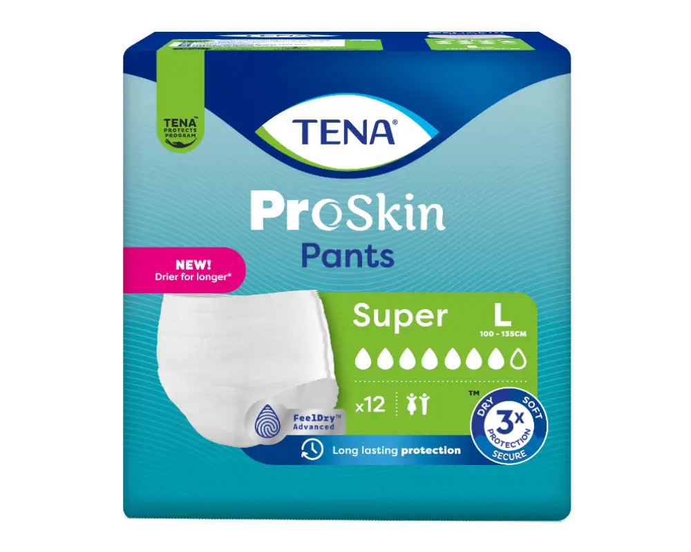 TENA Pants Super sind praktische Einweghöschen für mittlere bis starke Harninkontinenz – geeignet für Frauen und Männer. Das Produkt kombiniert Einlage und Höschen in einem und ist ideal für mobile, aktive Personen. Anwenderinnen und Anwender, die sich selbstständig versorgen, profitieren von der besonders einfachen Handhabung: Die Pants werden wie normale Unterwäsche getragen und bieten durch das elastische Material eine körpernahe, bequeme Passform an Hüfte, Bauch und Gesäß.
